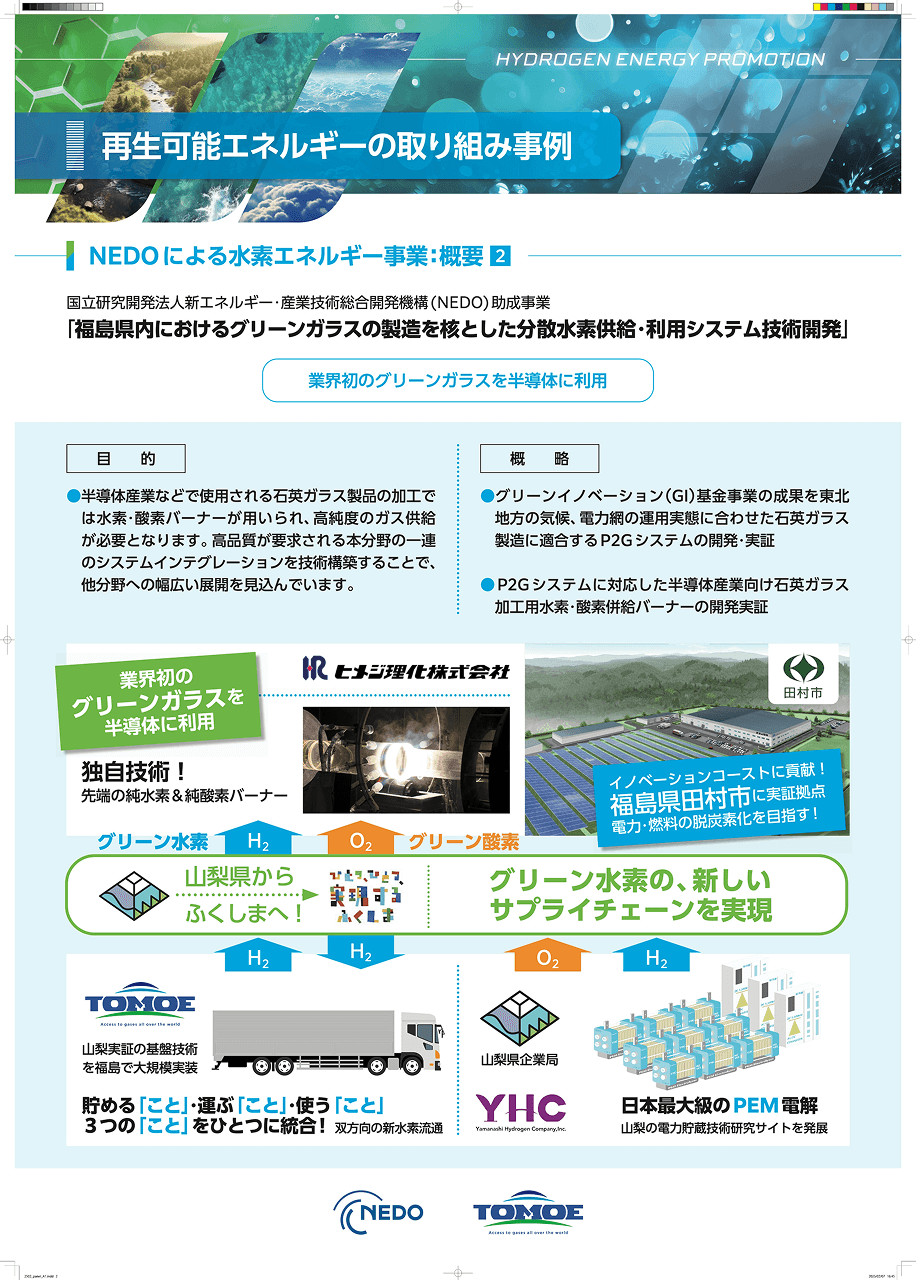 ふたつ目は、福島県田村市で進行中の国の助成プロジェクトだ。山梨県での「地産地消モデル」をベースに、さらに規模を拡大させた取り組みであり、巴商会を含めた合計3機関で連携して進められている。このプロジェクトでは、東北地方で発電された再生可能エネルギーを一時的に収集する拠点を福島県に設置し、そこで大規模に水素を製造する体制を整えている。再生可能エネルギーを活用して水を電気分解し、水素を生成する仕組みである。製造した水素は、工場内での活用を通じて脱炭素化を図るだけでなく、水素の製造から利用に至るまでの一連のプロセスを実証することも目的としている。