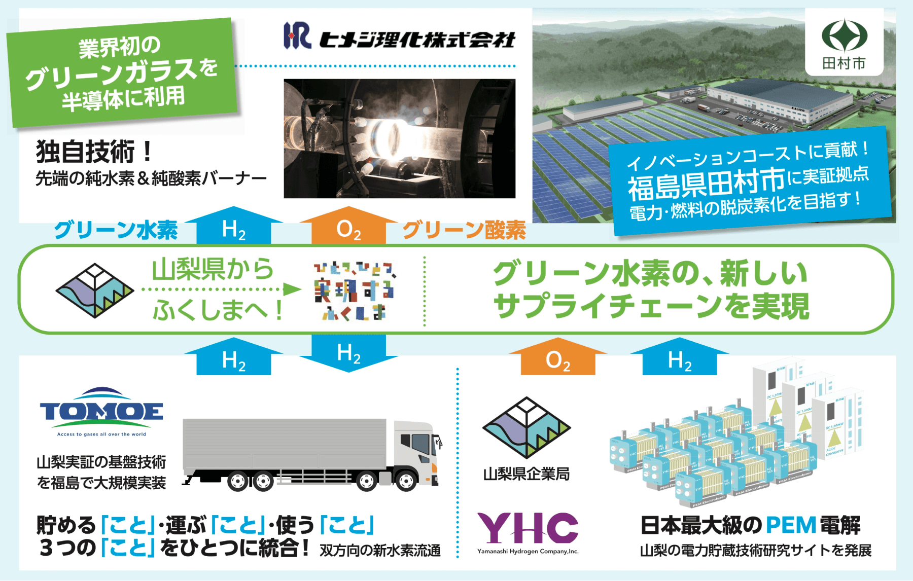 パイプラインの整備されていない地域では、水素の供給に課題があり、ボンベのような容器で保管・輸送する必要がある。巴商会は、50年以上にわたり水素を供給してきた技術を活かして、地域内での水素調達・輸送システムの構築を進めている。