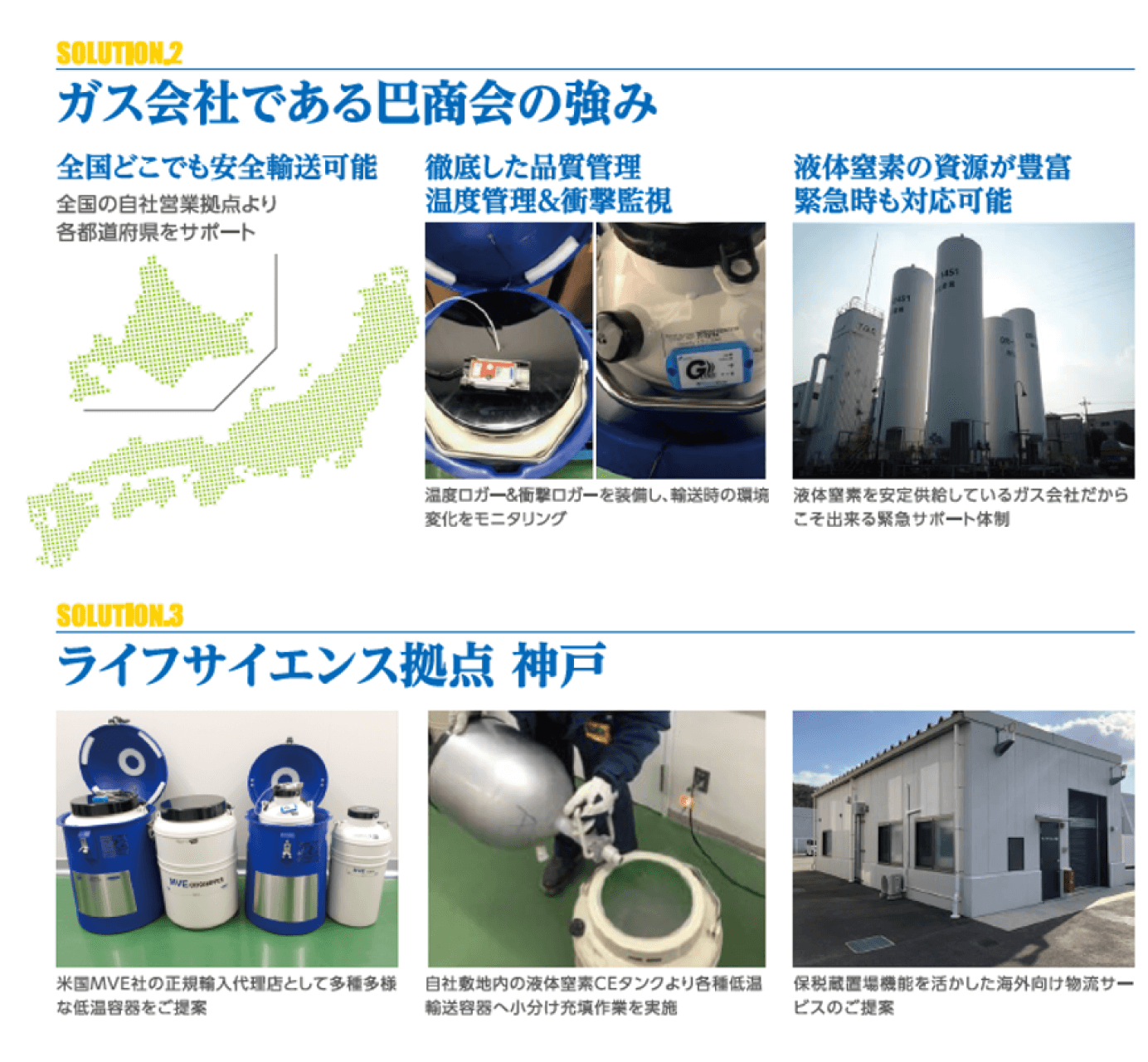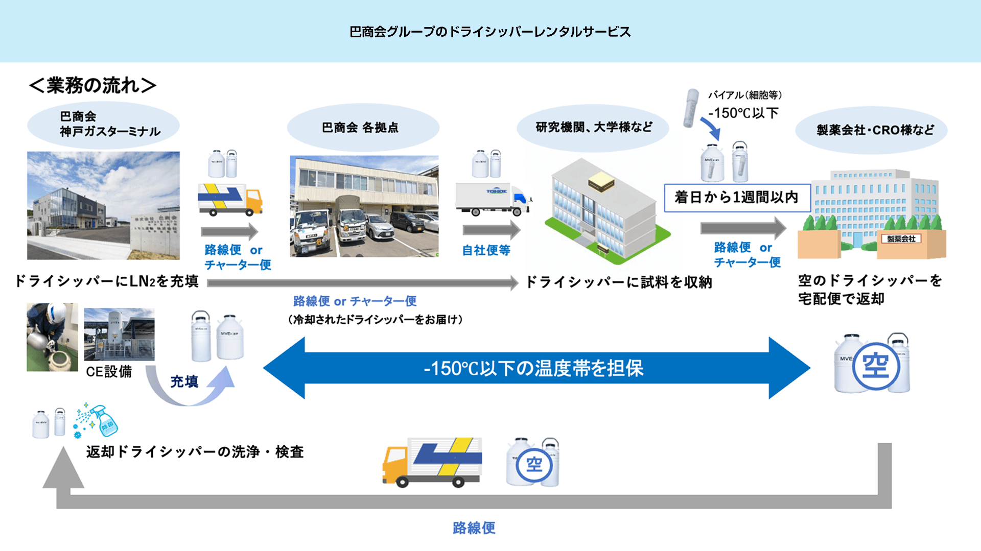 血液や細胞は、マイナス150度以下の極低温で動きが止まり、そのままの状態で保存することができる。この環境を実現するには、液体窒素を使った凍結技術が欠かせない。巴商会は、長年にわたって液体窒素による凍結保存容器を医療機関・製薬会社・研究機関へ提供し、医療の現場を見えないところから支えてきた。その実績をもとに、2019年にはライフサイエンス分野を本格的に事業化。ガスディーラーとして培った輸送・保管の技術を活かし、検体の保管から輸送までを一括で担う体制を築いた。